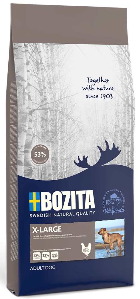 BOZITA Dog Original X Large Bozita Original X-Large est un aliment sec naturel pour chiens adultes de grande race, croquettes de taille XL, poulet frais et poudre de cynorhodon, santé des articulations et soutien du système immunitaire.