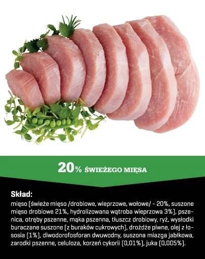Viande (viande fraîche /volaille, porc, bœuf/ – 20%, viande de volaille séchée 21%, foie de porc hydrolysé 3%)