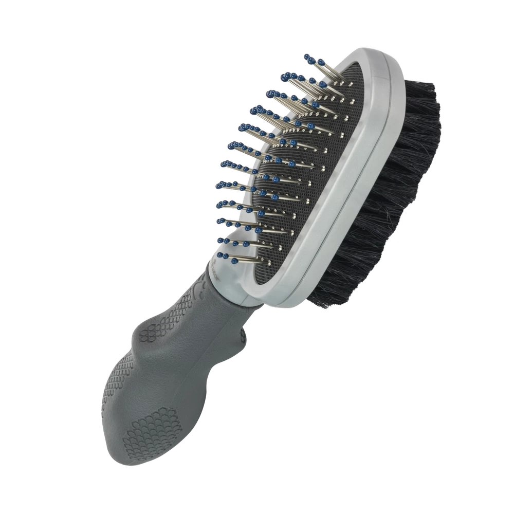 Une brosse de toilettage double 2 en 1 avec des poils durs et doux pour peigner le pelage et finir la coiffure.