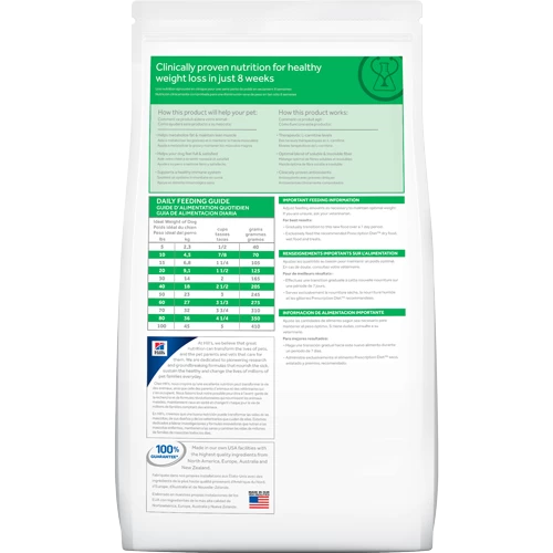 Hill’s PD Prescription Diet Canine r/d est un aliment dont la formule vétérinaire a été développée pour les chiens adultes souffrant de diabète sucré, de troubles gastro-intestinaux, de surpoids ou pour prévenir sa réapparition, également chez les chiens atteints de lithiase. Favorise le maintien d’un poids corporel normal après une perte de poids. Prévention des calculs de struvite chez les chiens sujets à l’obésité.
