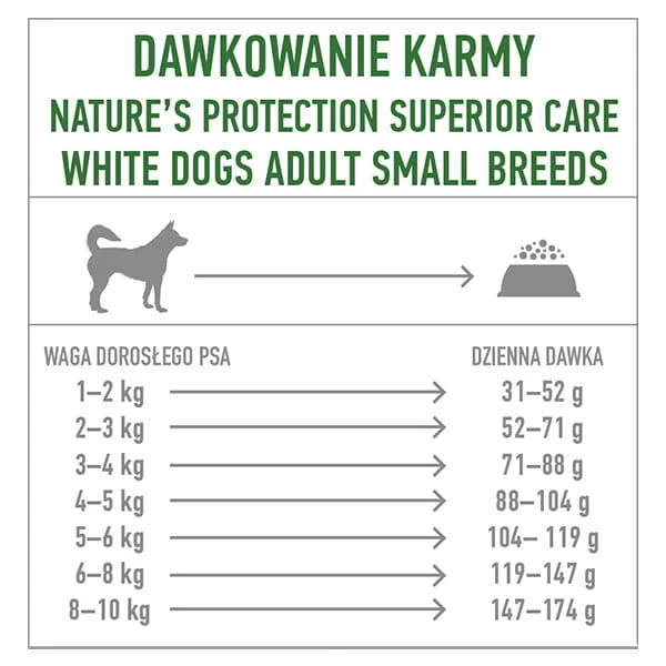 Nature’s Protection Superior Care White Dogs Grain Free Insects Adult Small Breeds est un aliment sec complet de haute qualité, sans céréales et sans insectes, destiné aux chiens adultes de petite race (1-10 kg) à poils blancs. Les aliments peuvent être donnés aux chiens à partir de l’âge de 10 mois.