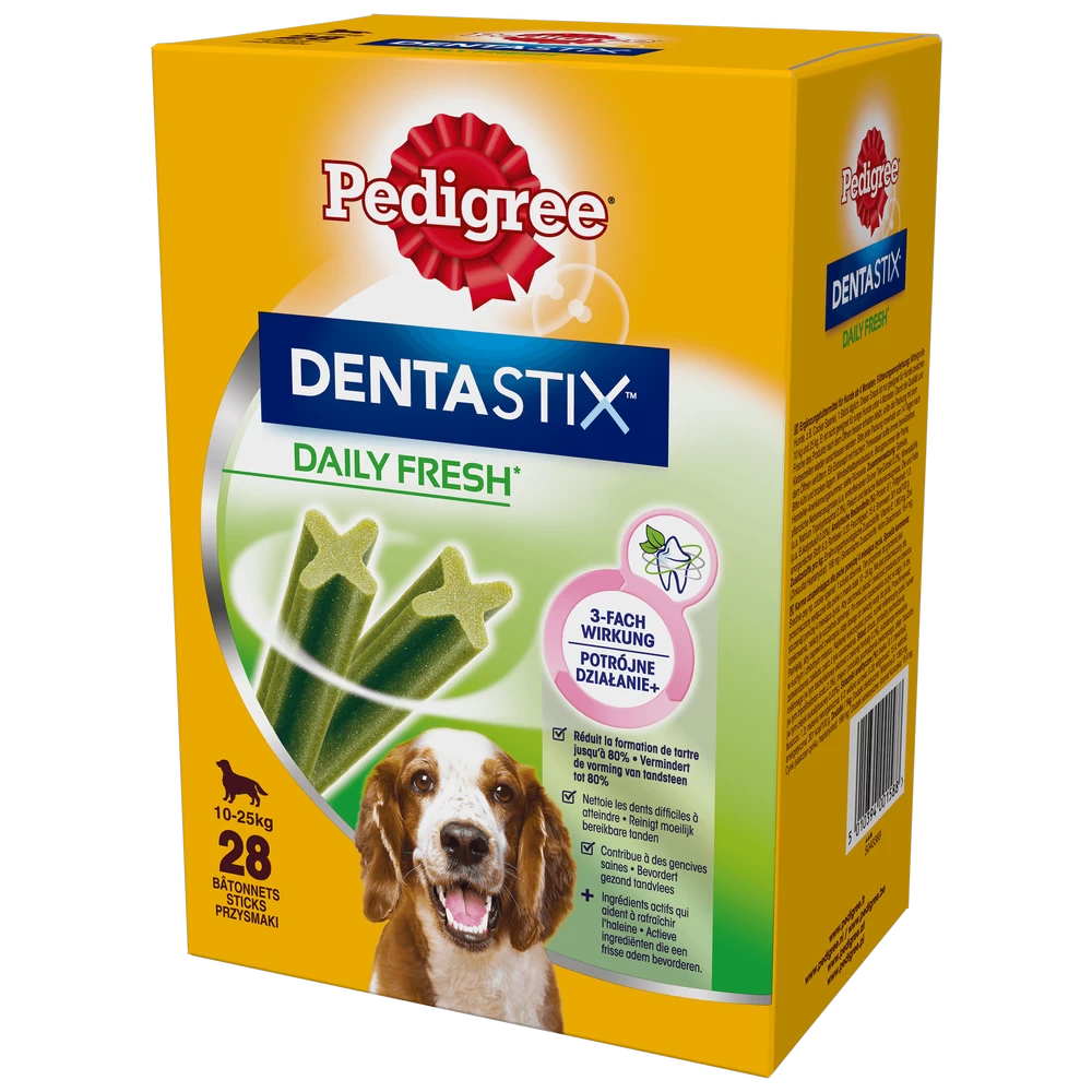 PEDIGREE® DentaStix™ Daily Fresh est un aliment complémentaire pour les chiens âgés de plus de 4 mois. Grâce à ses principes actifs et à un mélange unique d’extrait de thé vert et d’huile d’eucalyptus, il rafraîchit l’haleine de votre animal. Offrez chaque jour à votre chien une délicieuse et efficace friandise dentaire PEDIGREE® DENTASTIX™ Daily Fresh afin de préserver la santé et la solidité de ses gencives. Ces friandises ne contiennent ni sucres, ni colorants ou arômes artificiels. Ils sont conçus exclusivement pour les animaux de compagnie pesant entre 10 et 25 kg.