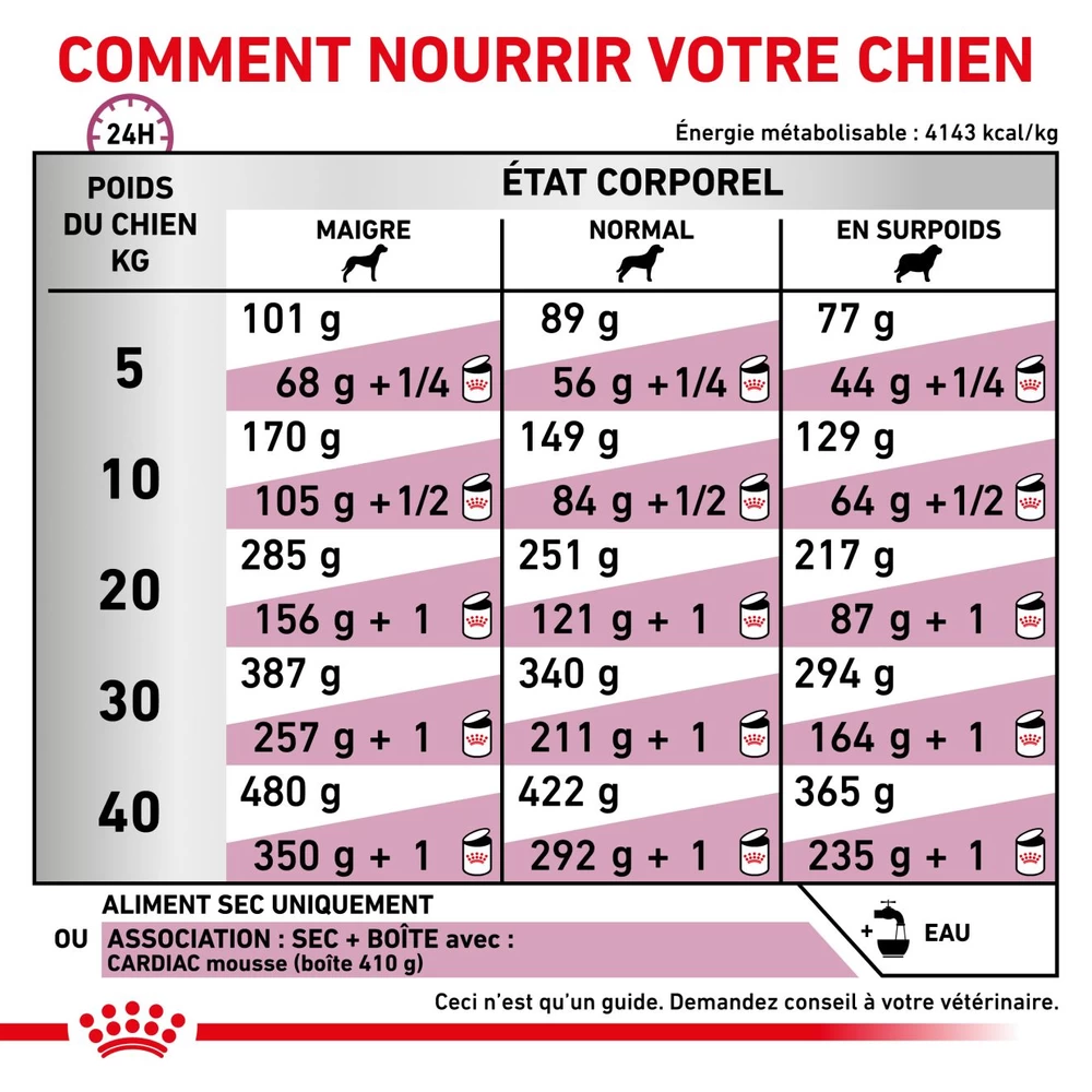 ROYAL CANIN® CARDIAC sec est un aliment diététique complet pour chiens en vue de soutenir la fonction cardiaque en cas d’insuffisance cardiaque chronique. Cet aliment contient une teneur limitée en sodium. RECOMMANDATIONS : Avant utilisation ou prolongation de la durée d’utilisation, il est recommandé de demander l’avis d’un vétérinaire. Utiliser au départ CARDIAC sec pour une durée allant jusqu’à 6 mois.