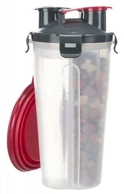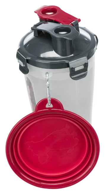 La bouteille a deux sections, de sorte qu’un compartiment est destiné à l’eau et l’autre à la nourriture, et un petit bol de voyage est inclus. Les ouvertures séparées vous permettent de choisir le compartiment que vous souhaitez vider. Grâce au bol inclus, vous pouvez facilement donner de la nourriture ou de l’eau à votre animal en voyage. Grâce au crochet, vous pouvez facilement l’accrocher à votre sac et l’emporter avec vous en voyage, à vélo ou lors de longues promenades.