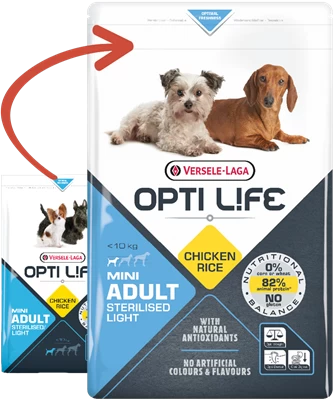 Opti Life Adulte Sterilised/Light Mini est une formule parfaitement équilibrée pour les petites races (< 10kg) à base de poulet et de riz contribuant à maîtriser le poids corporel de votre chien.