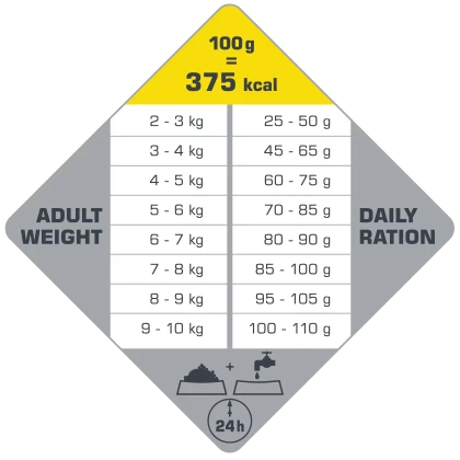 82 % des protéines présentes sont d’origine animale et, en combinaison avec du riz, celles-ci assurent une digestion facile et une bonne consistance des excréments. La composition extrêmement savoureuse est sans gluten et ne contient donc ni blé ni maïs. Le risque d’allergies alimentaires ou d’intolérances s’en trouve ainsi réduit.