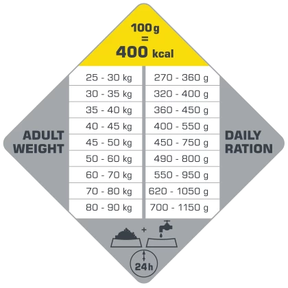 • Les conseils nutritionnels constituent toujours une ligne directrice. C’est pourquoi il importe de toujours tenir à l’œil la condition physique générale et le poids de votre chien. La quantité de nourriture quotidienne à donner à votre chien dépend de son activité et doit être adaptée en conséquence.
